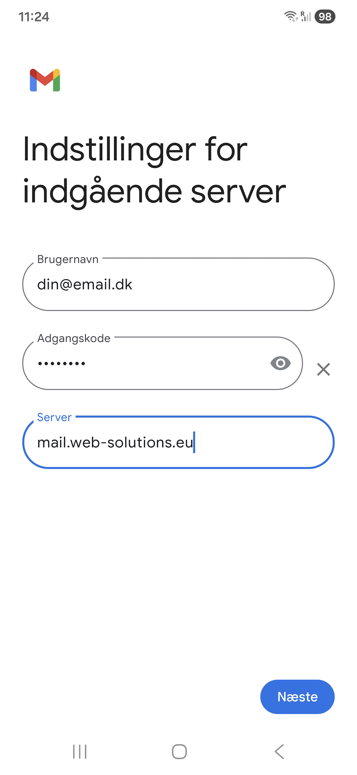 8. Skift den indgående server til mail.web-solutions.eu, og tryk på Næste.