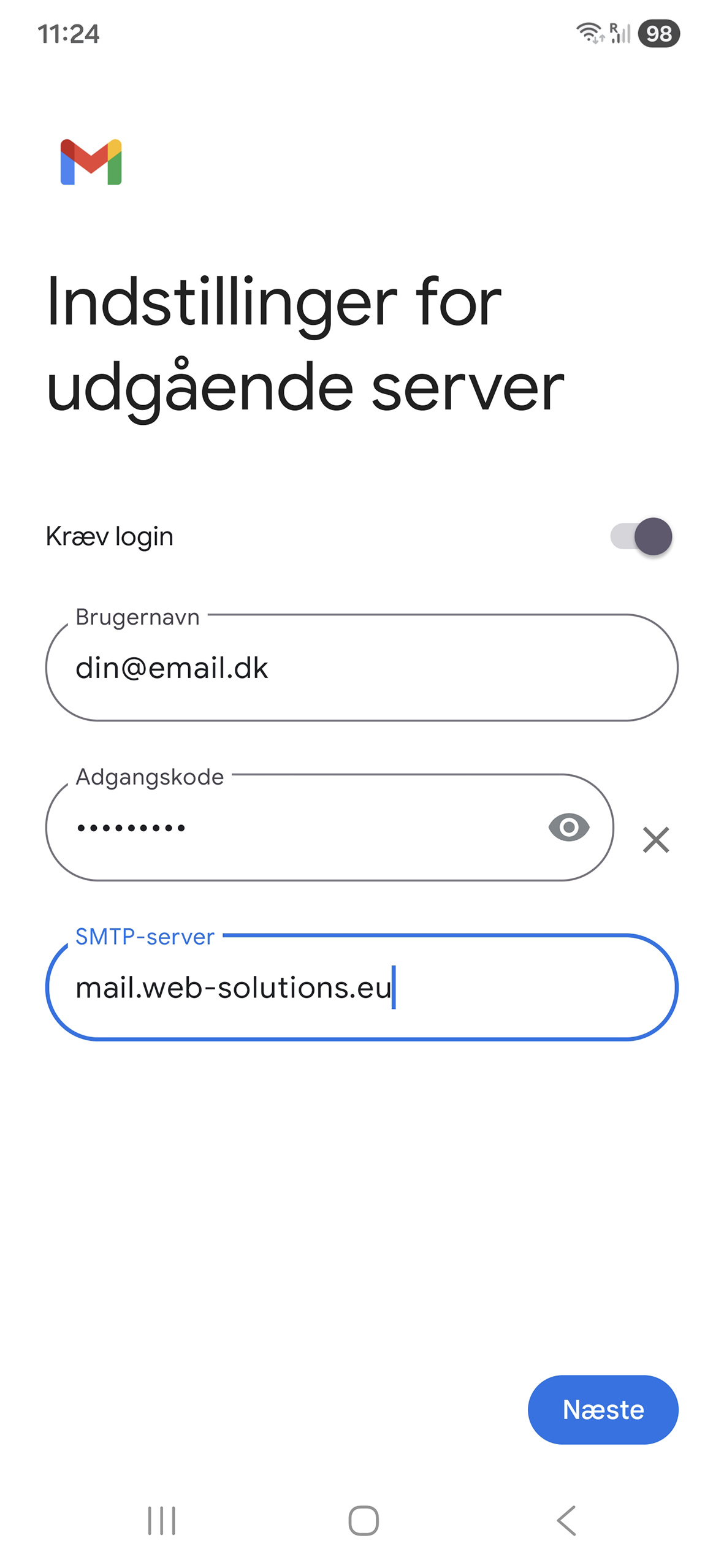 9. Skift den udgående server til mail.web-solutions.eu, og tryk på Næste.